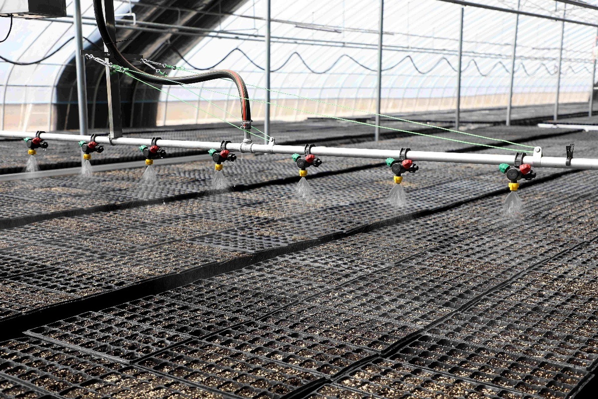物聯(lián)網(wǎng)系統(tǒng)的智慧噴灌設(shè)備正在育苗床上作業(yè)。林國強攝