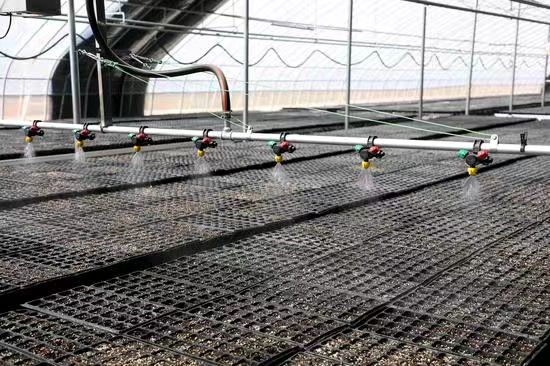 物聯(lián)網(wǎng)系統(tǒng)的智慧噴灌設(shè)備正在育苗床上作業(yè)。林國強(qiáng) 攝