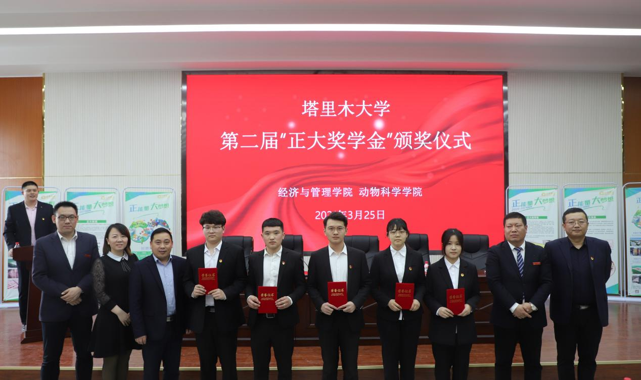 3月25日,塔里木大學第二屆“正大獎學金”頒獎典禮在文科實驗樓報告廳舉行。正大集團新疆區禽料銷售總經理孫巖,正大集團新疆區人力資源管理部經理張湛,經管院黨委副書記、院長蔣志輝,塔里木大學學生工作部副部長陳蕾,動科院黨委副書記魏曉柳和部分師生代表參加典禮。由學院學辦副主任李新龍主持。