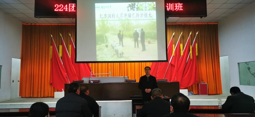 團隊成員王新建教授、董紅強教授以及程奇高級農藝師分別就棗園管理、棗樹栽培技術進行講解,對早熟修建和病蟲害防治進行現場指導,還對病蟲害預測以及農藥識別給出建議。鄉村振興,人才是關鍵。我校緊緊圍繞農業農村經濟發展中的技能需求,根據224團林果業需求和果樹栽培關鍵時間點,及時田間技能培訓,采取理論與實踐相結合的“菜單式”培訓模式,為十四師224團現代農業發展人才培養提供了有力科技支撐。