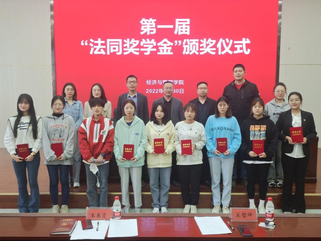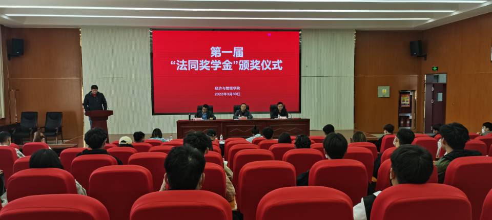 3月30日下午,經管院舉行第一屆“法同獎學金”頒獎儀式。學院黨委副書記谷建杰,優秀校友代表新疆法同商業運營管理有限公司董事長趙永杰,經貿系黨總支書記朱哲,全體輔導員及70余名學生代表參加。儀式由學辦副主任李新龍在新文科樓504報告廳主持。