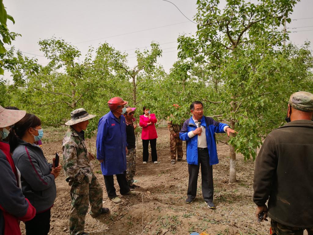 在53團良種連,張琦教授分析了梨樹坐果率低的原因,對后期梨樹保花保果、減少落果、提高果品進行了培訓,提出了增施復合肥、噴施葉面肥、提早夏季修剪、培養結果枝組等管理技術措施。