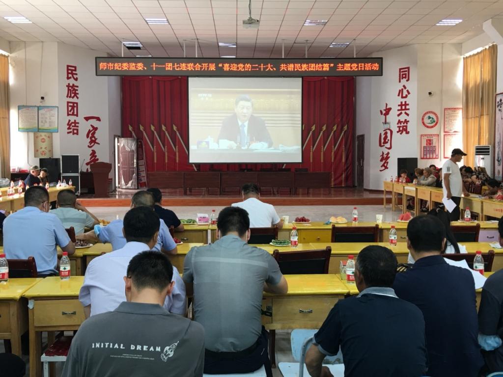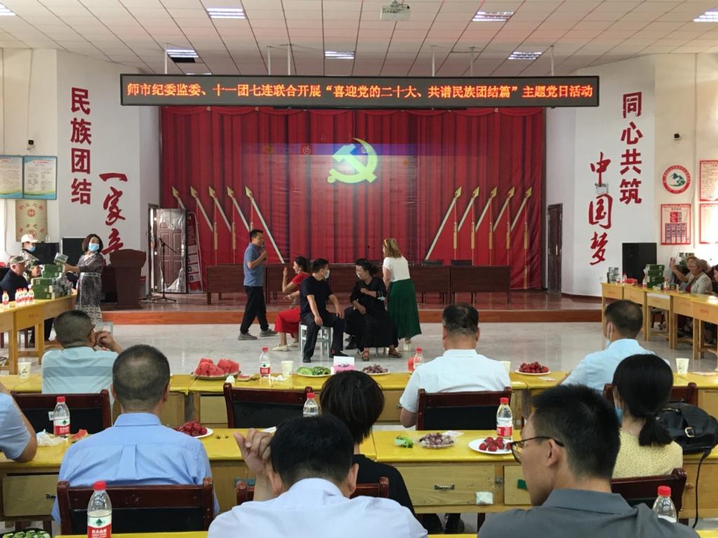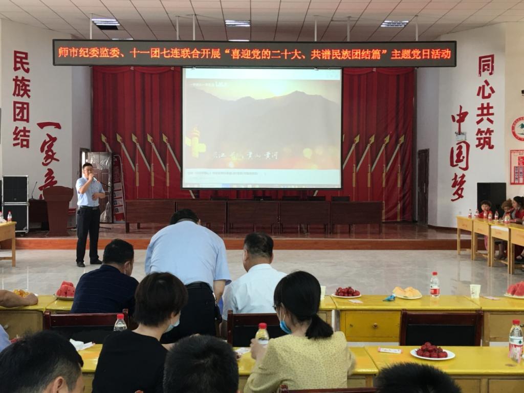 5月26日,師市黨委常委、紀委書記、監委主任彭勃帶領師市紀委監委機關黨總支全體黨員干部專程來到十一團七連,與十一團七連黨支部和“訪惠聚”工作隊共同舉辦了“喜迎黨的二十大,共譜民族團結篇”主題黨日暨“濃情端午粽飄香,民族團結一家親”民族團結聯誼活動。活動由師市紀委副書記、監委副主任葉戩主持。