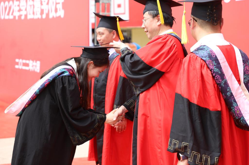 趙峰華、院領(lǐng)導(dǎo)為2022屆畢業(yè)生正冠,授予學(xué)位證書,并送上畢業(yè)紀(jì)念品和鮮花,祝福畢業(yè)生前程似錦,一路順風(fēng)。