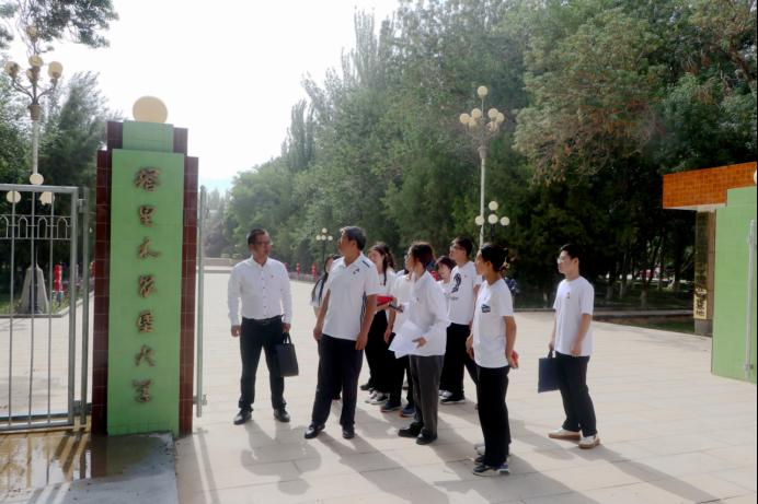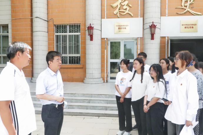 在校史館門前,看見團隊師生們在傾聽王合理教授講述校史時,黨委書記趙光輝上前同王合理教授、團隊師生們親切交談了起來。叮囑師生們要珍惜這個寶貴的機會,多多向老領導老教授請教學習,賡續紅色血脈,傳承紅色基因,發揚優良作風,繼承優良傳統,踐行胡楊精神,爭做愛國愛疆、擔當奉獻、扎根邊疆、獻身邊疆的堪當民族復興重任的新時代戍邊人,在青春的賽道上奮力跑出最好成績,讓胡楊種子、青春之花灑滿南疆大地。