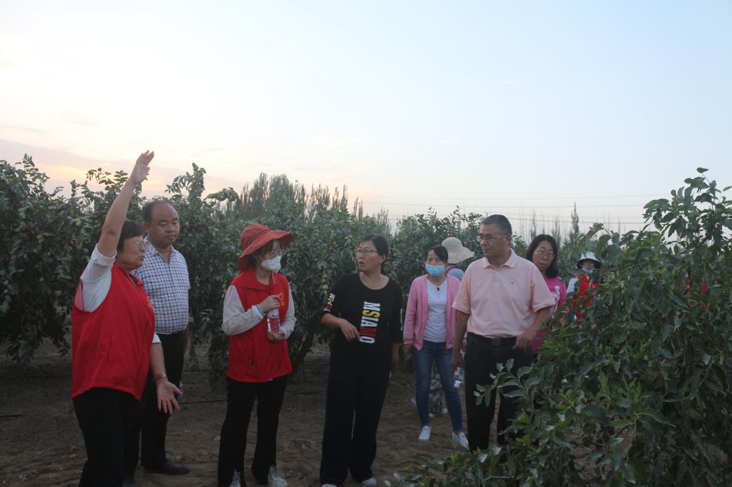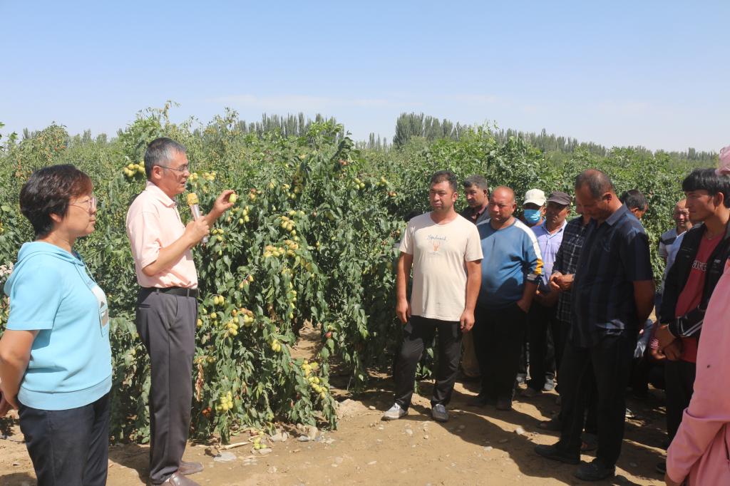 團(tuán)隊(duì)成員走訪了第十四師224團(tuán)、47團(tuán)棗園,對(duì)主干型棗樹坐果率和結(jié)實(shí)特性、棗樹裂果及病蟲害防治情況進(jìn)行了調(diào)查,并與果農(nóng)深入交流,重點(diǎn)對(duì)主干形棗園技術(shù)、紅棗的裂果防治方法、棗樹高接換種技術(shù)操作要點(diǎn)及棗樹蚧殼蟲防治辦法作詳細(xì)的指導(dǎo)。