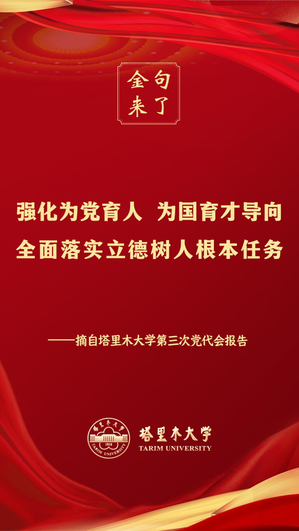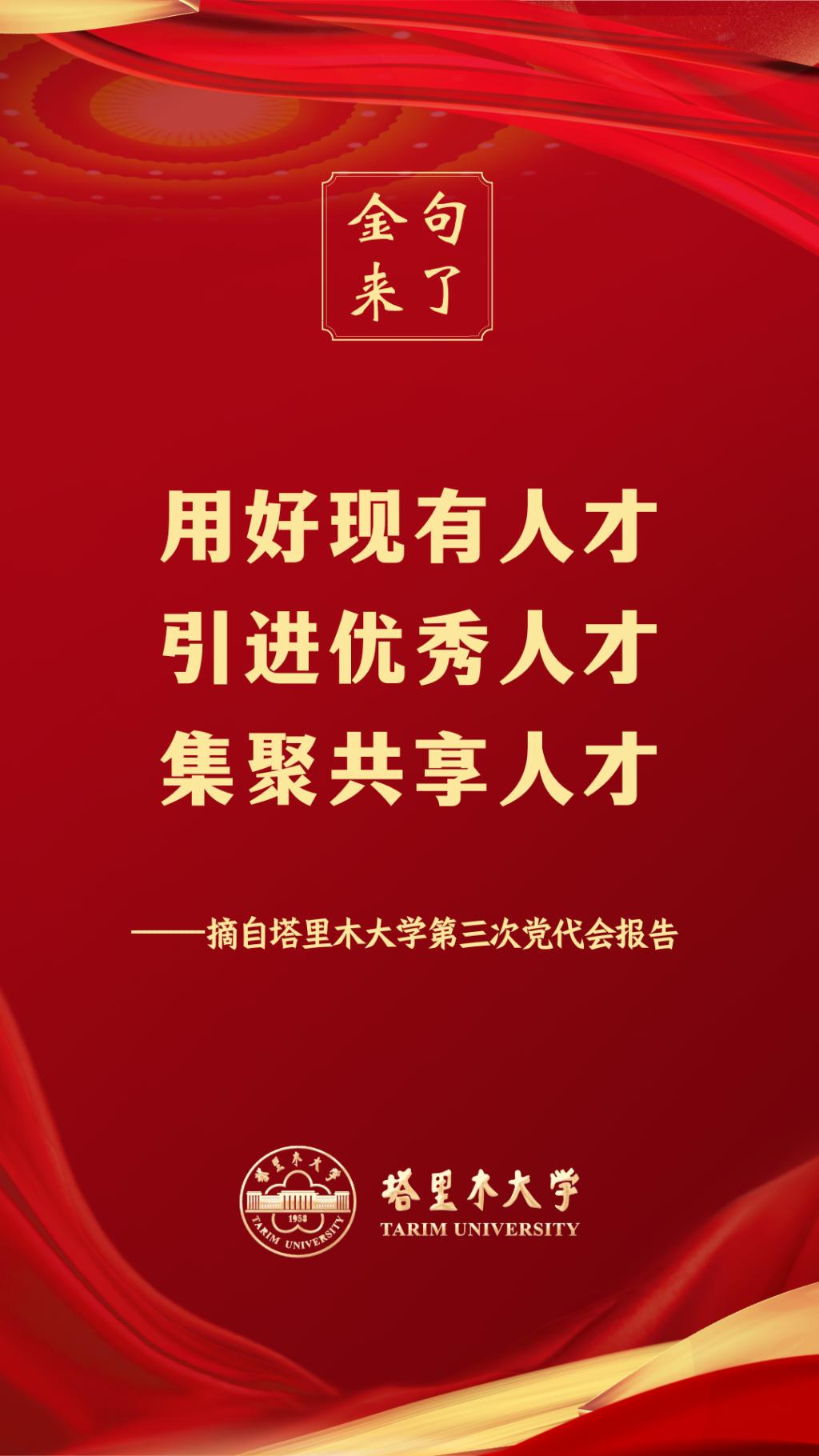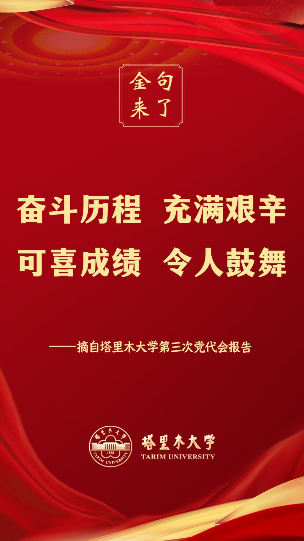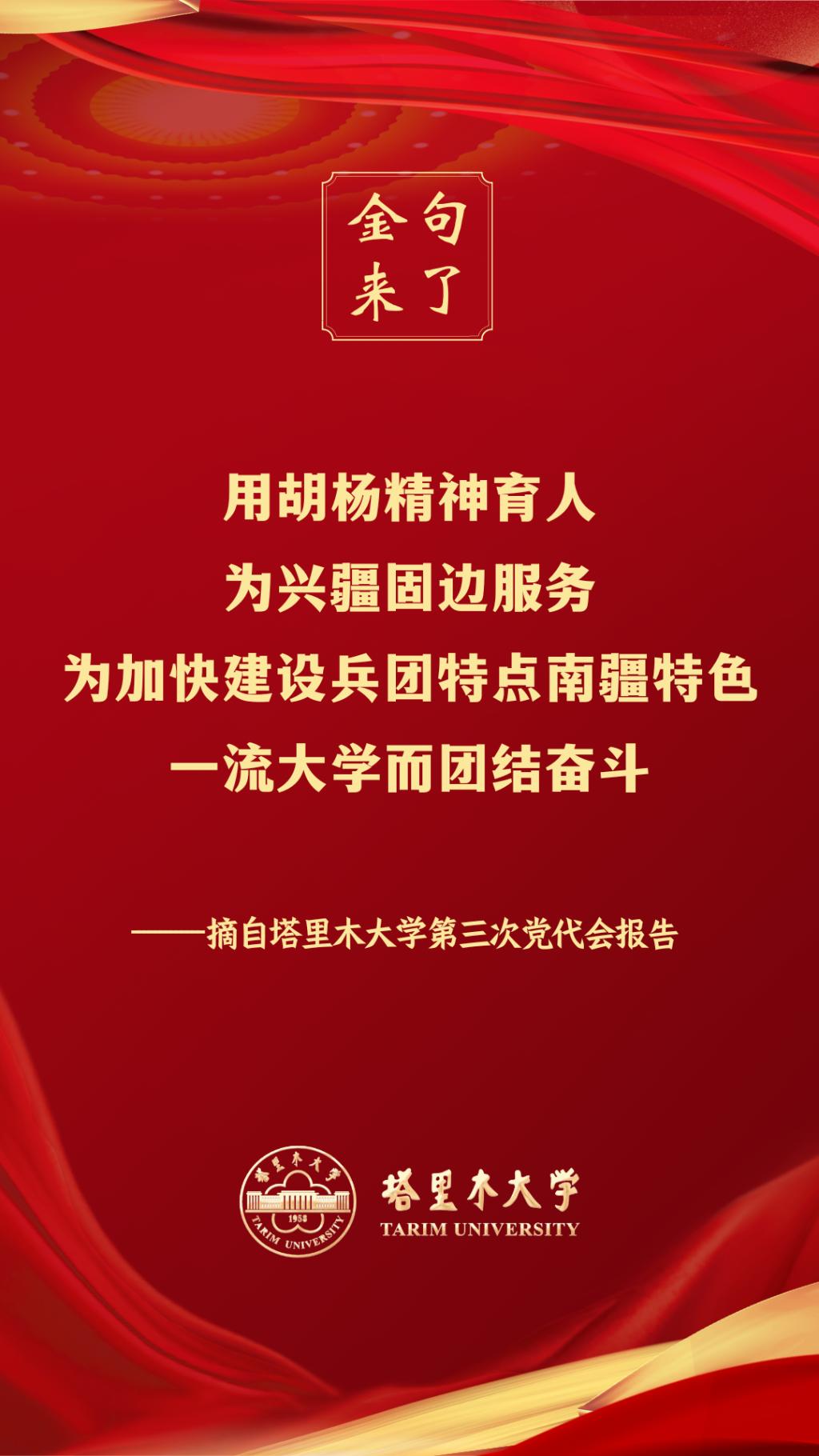 3月10日,中國共產(chǎn)黨塔里木大學(xué)第三次黨員代表大會勝利開幕。黨委書記張愛萍代表中國共產(chǎn)黨塔里木大學(xué)第二屆委員會作了題為《用胡楊精神育人 為興疆固邊服務(wù) 為加快建設(shè)兵團(tuán)特點(diǎn)南疆特色一流大學(xué)而團(tuán)結(jié)奮斗》的報告,現(xiàn)將報告中的金句進(jìn)行梳理,全校師生快學(xué)起來吧!