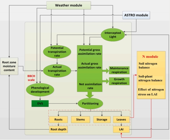 統計學氮肥需求分析方法通常適用于特定的土壤和氣候環境,無法實現氮素需求的定量分析,植物生長模擬可為分析土壤-植物-大氣-管理之間的耦合關系提供定量分析手段,然而,國際上關于果樹生長氮運移和氮效應模擬研究報道極少。本研究將氮動力學理論和模塊集成到WOFOST模型,并通過BBCH尺度對梨樹物候學進行精細劃分改進光合作用模塊,構建了新的果樹生長模型WOFOST-N。改進后的WOFOST-N模型在梨樹葉片、果實干重、葉面積指數、土壤氮素含量和氮素使用效率模擬方面均表現了較好的性能,可為果樹生長模擬、氮效應評價和精準施肥提供定量分析方法。