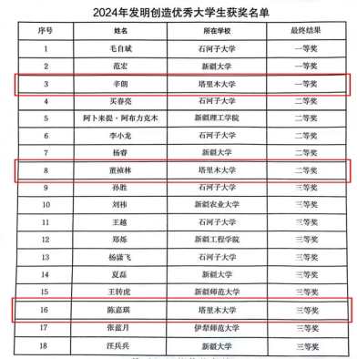 近日,自治區市場監督管理局(知識產權局)、自治區教育廳、兵團市場監督管理局(知識產權局)、兵團教育局聯合舉辦2024年新疆發明創造優秀大學生評選活動。我校水利與建筑工程學院辛郎榮獲一等獎;農學院董禎林榮獲二等獎;水利與建筑工程學院陳嘉琪榮獲三等獎,塔里木大學榮獲“優秀組織單位”稱號。