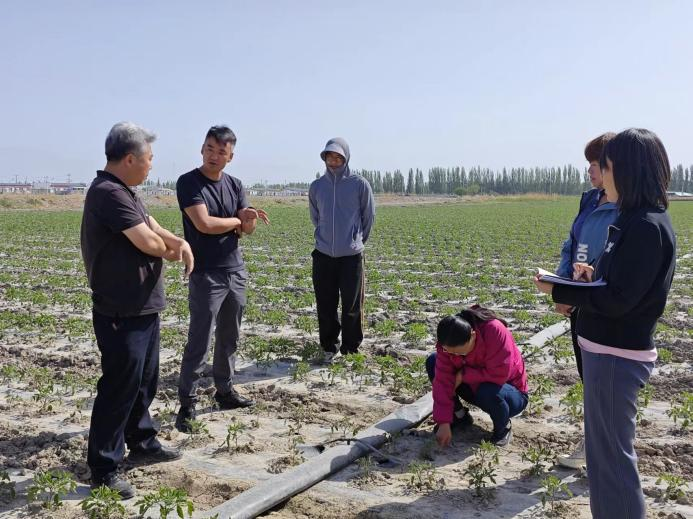 團隊成員與二十二團二連、九連職工代表就連隊發展現狀、種植結構、作物病蟲害防治、肥料施用等進行深入交流,深入番茄、辣椒等種植區,實地調研作物種植生長和產業發展情況并進行水資源利用指導。團隊成員還對二十五團及博湖縣本布圖鎮的作物種植田塊進行土壤取樣并化驗。
