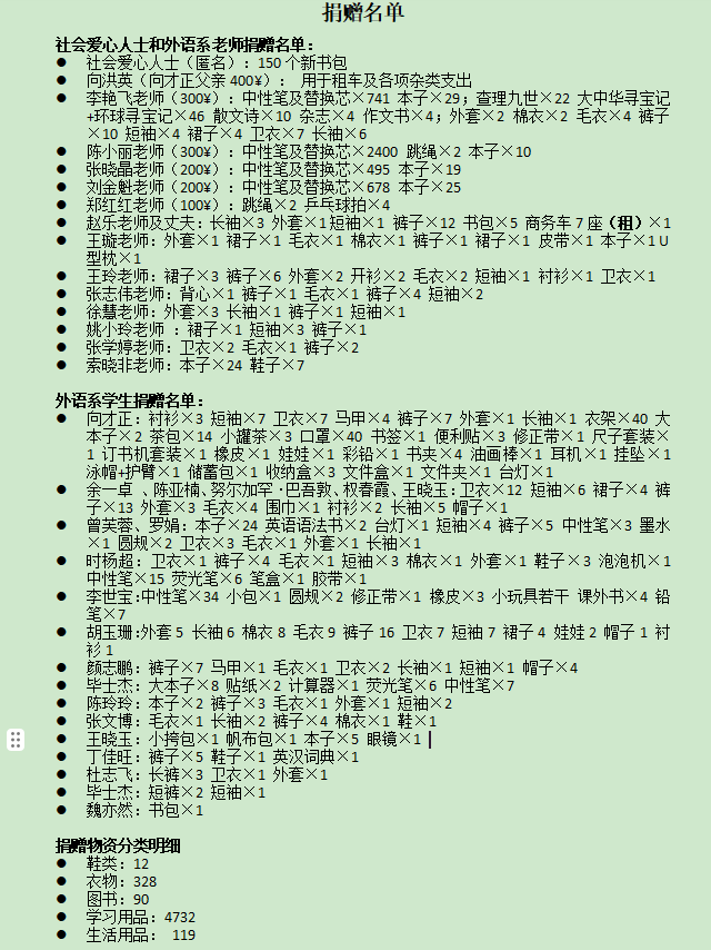 外語系委派專人負責向小學愛心捐贈事宜,第一時間通過召開會議、發起倡議等方式,把捐贈愛心的消息傳播到了整個外語系。