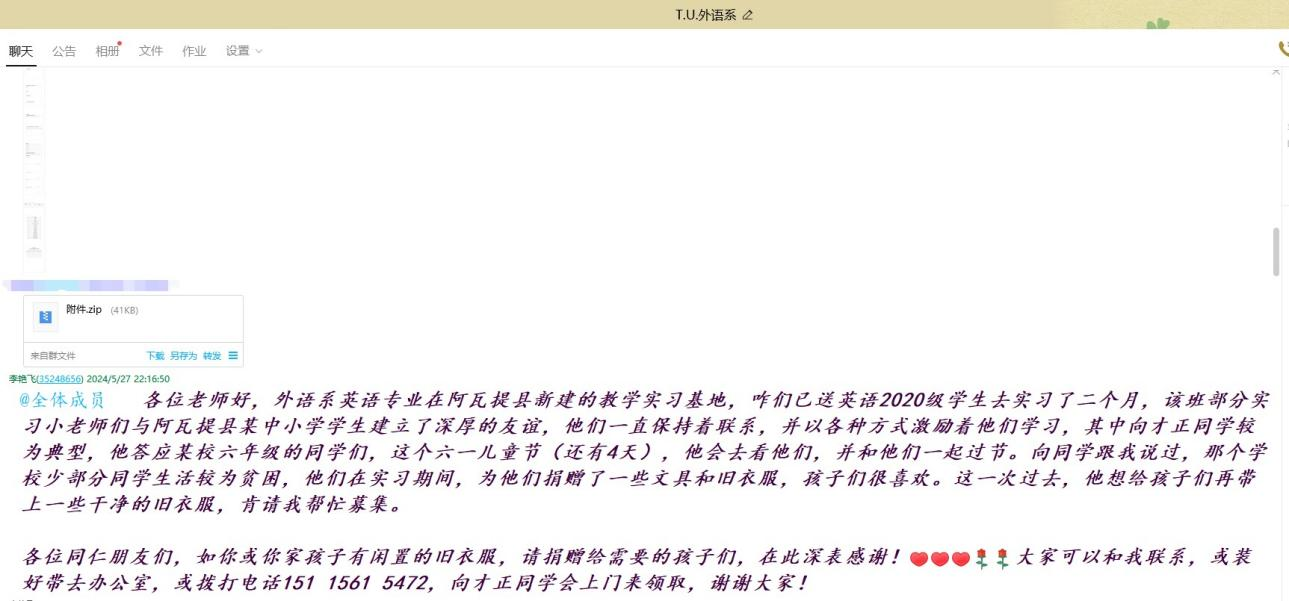 除此之外,外語系積極聯系阿瓦提縣教科局,希望教科局能大力支持小學的教育投入。另一方面,向才正和同班同學繼續收集小學生的學習和生活物資訴求,及時向全院師生反饋,讓小朋友的切實需求盡量得到大家的支持和幫助。