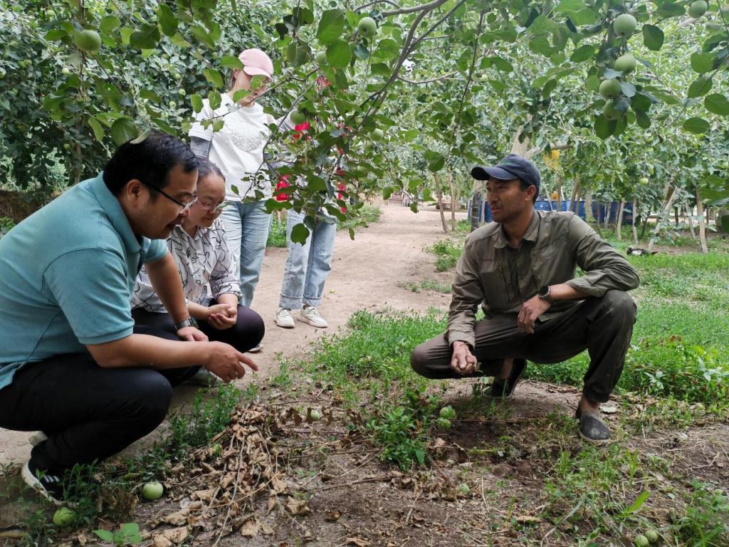 團隊成員深入位于托布魯克鄉的阿克蘇蘋果種植區,實地走訪農戶了解當地優質蘋果種植技術及病蟲害發生情況,并就南疆地區蘋果病害生物防治,與當地農戶進行交流。