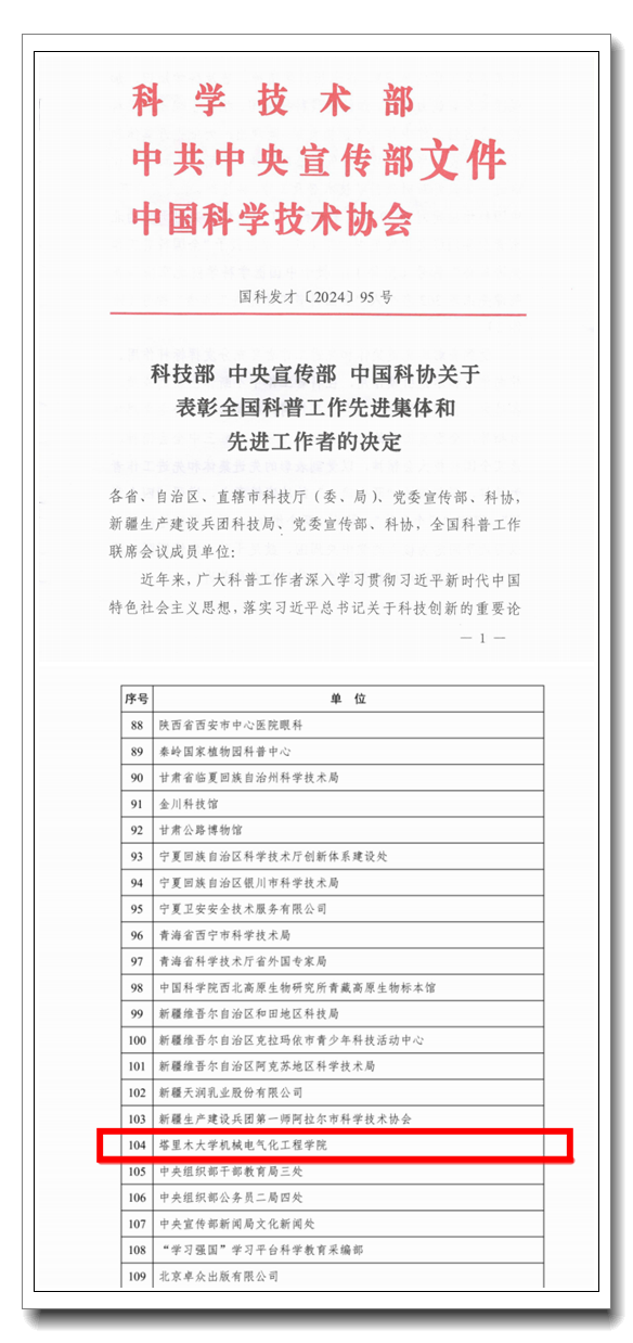 近日,科學技術部、中共中央宣傳部、中國科學技術協(xié)會聯(lián)合下發(fā)《科技部中央宣傳部中國科協(xié)關于表彰全國科普工作先進集體和先進工作者的決定》。我校機械電氣化工程學院榮獲“全國科普工作先進集體”。