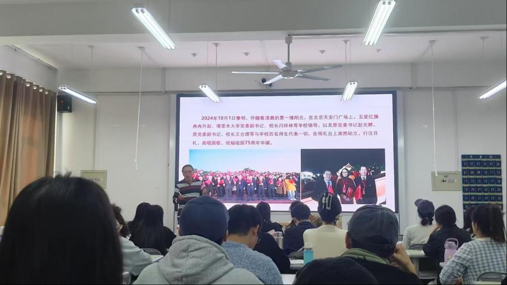 觀禮教師代表高禮增在政治理論學習會上,向全院教師分享了這段難忘的回憶。他講到,作為兵團高校的一名思政課教師,要將愛國主義植根于心,胡楊精神實踐于行,堅持用胡楊精神育人,為興疆固邊服務,將愛國主義教育融入日常教育教學中,把中國故事、新疆故事、兵團故事、塔大故事講好、講生動,講到師生心中去,為培養更多有理想、敢擔當、能吃苦、肯奮斗的新時代胡楊做出積極貢獻。