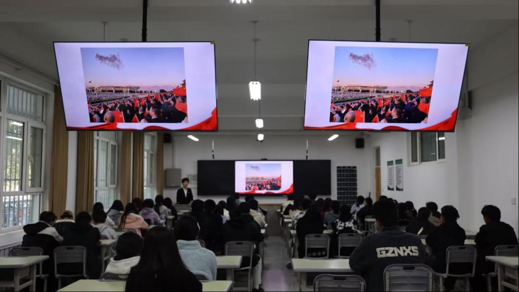 觀禮學生代表郭毅博走近教師群體、學生黨員群體、學生群體分享了觀禮心得。他講到,跨越3500多公里,只為心中那份愛,回望整個升旗儀式,我深感無比榮幸、無比自豪。作為一名胡楊學子,此生能在天安門廣場觀禮臺觀禮,能為祖國母親75周歲生日慶生是何等的激動和驕傲。我愿成為新征程上的“接棒人”,以吾輩二十歲青春之名,奮力跑出加速度,為實現中華民族偉大復興貢獻青春力量!