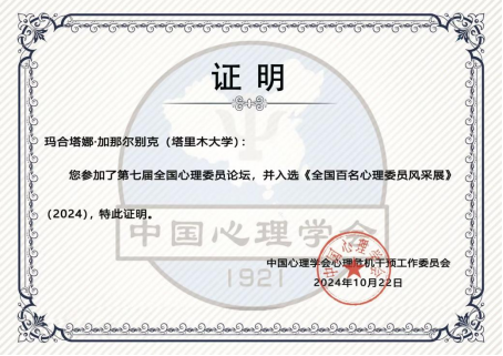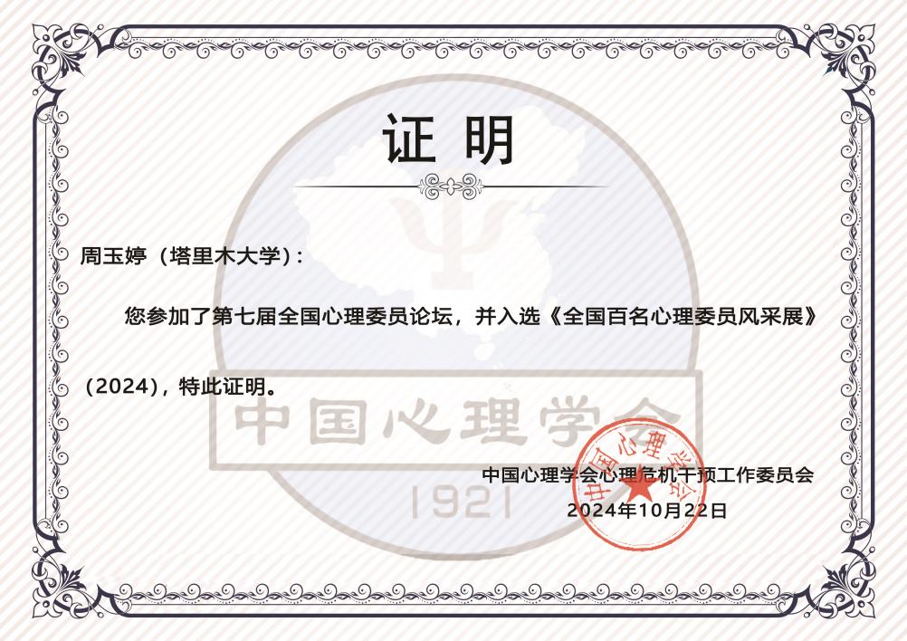近日,由中國心理學會心理危機干預工作委員會舉辦的第十九屆全國高校心理委員工作研討會暨朋輩輔導論壇在北京大學圓滿落幕。我校推薦的機械電氣化工程學院2022級心理委員周玉婷(指導老師:王佳豪)、人文學院2023級心理委員瑪合塔娜·加那爾別克(指導老師:艾力海木·艾尼瓦爾)工作事跡入選《全國百名心理委員風采》著作。