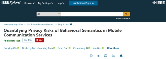 1月25日,我校新引進博士邱國英在《IEEE Transactions on Information Forensics and Security》發表了題為“Quantifying Privacy Risks of Behavioral Semantics in Mobile Communication Services”的學術論文。該期刊為中國計算機學會推薦的網絡與信息安全領域國際頂級期刊,CCF-A類Trans;同時為中科院SCI一區Top期刊,影響因子6.3。邱國英博士為論文第一作者,白鐵成教授為通訊作者。