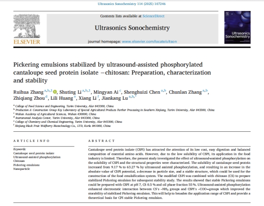 近日,我校食品科學與工程學院研究生張瑞華、李舒婷在國際頂級期刊《Ultrasonics Sonochemistry》(SCI,中科院一區TOP期刊,IF:8.7)上發表了題為“Pickering emulsions stabilized by ultrasound-assisted phosphorylated cantaloupe seed protein isolate-chitosan: Preparation,characterization and stability”的研究論文。張瑞華與李舒婷為第一作者,陸健康副教授為通訊作者。該研究得到國家自然科學基金地區基金項目、塔里木大學食品科學與工程學科建設項目經費支持,塔里木大學分析測試中心協助。