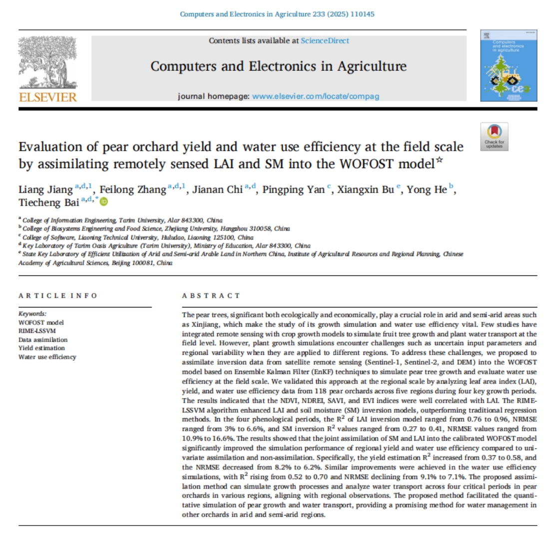 近日,我校農業(yè)工程專業(yè)碩士研究生姜亮、張飛龍在國際頂級期刊《Computers and Electronics in Agriculture》(SCI,中科院一區(qū)TOP期刊,IF:7.7)上發(fā)表了題為“Evaluation of Pear Orchard Yield and Water Use Efficiency at the Field Scale by assimilating Remotely Sensed LAI and SM into the WOFOST Model”的研究論文。姜亮、張飛龍為共同第一作者,白鐵成教授為通訊作者。該研究得到國家自然科學基金、兵團科技項目和塔里木綠洲農業(yè)教育部重點實驗室的支持。
