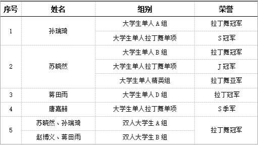 近日,中國(guó)·新疆體育舞蹈公開賽暨自治區(qū)第27屆體育舞蹈錦標(biāo)賽、新疆省隊(duì)選拔賽在烏魯木齊市奧體中心落幕。我校體育舞蹈代表隊(duì)派出5名選手參加,最終,獲得6項(xiàng)冠軍,1項(xiàng)亞軍,1項(xiàng)季軍。