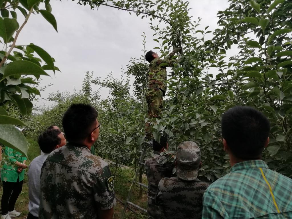 兩個(gè)小時(shí)的現(xiàn)場教學(xué),張教授不僅在樹下,還搭梯爬樹,親自為職工示范“打頂”、“扭枝”、“抹芽”等具體操作,是名副其實(shí)的“上樹教授”。除了講解,張教授還讓職工們上手實(shí)踐,并及時(shí)糾正,讓職工們真正掌握技術(shù),學(xué)會田管本領(lǐng)。除此之外,張教授還指導(dǎo)了已完成修剪和田管的職工梨樹地,將下一步要注意的重點(diǎn)工作向他們一一叮囑。