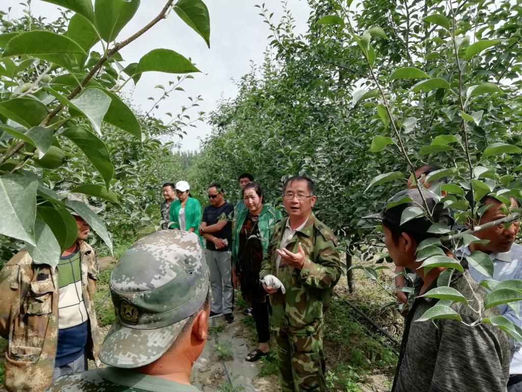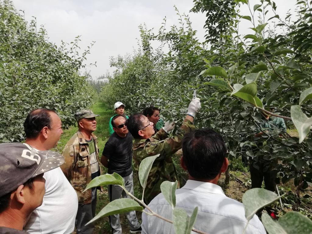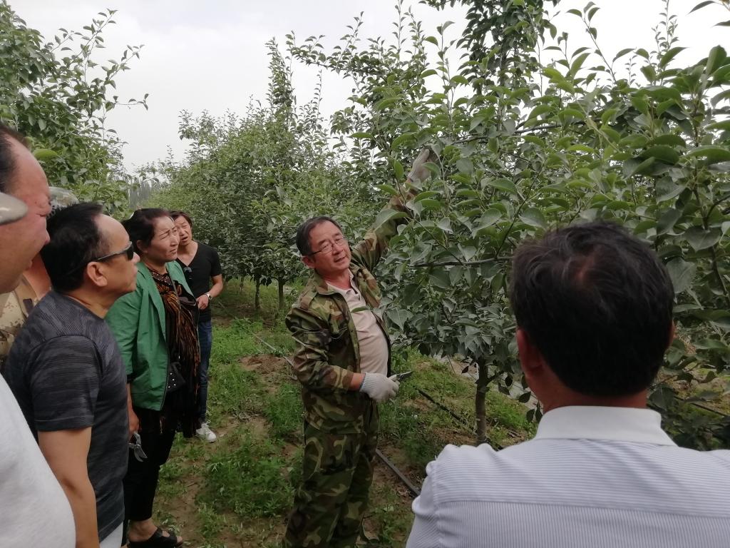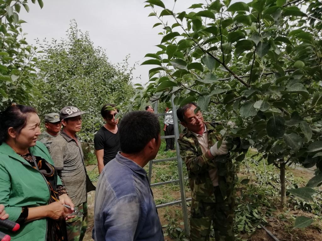 張教授查看了試驗(yàn)田長勢,待職工都聚集完畢,他開始向職工們現(xiàn)場教學(xué)。“科學(xué)進(jìn)行田間管理,將會對當(dāng)年和次年的座果率起到非常大的作用!”教授一邊講解,一邊為身邊的職工群眾做示范,從透光率、通風(fēng)率,到消除頂端優(yōu)勢,讓營養(yǎng)富集果實(shí),他盡量將專業(yè)術(shù)語轉(zhuǎn)化成老百姓通俗易懂的實(shí)用技術(shù),還時(shí)不時(shí)回答著職工提出的顧慮問題。圍繞提質(zhì)增效、養(yǎng)樹護(hù)林等不僅讓職工群眾了解如何使果樹多結(jié)果子,更用發(fā)展的眼光教會大家要可持續(xù)種植,會養(yǎng)會管,這樣才能持續(xù)增收致富。