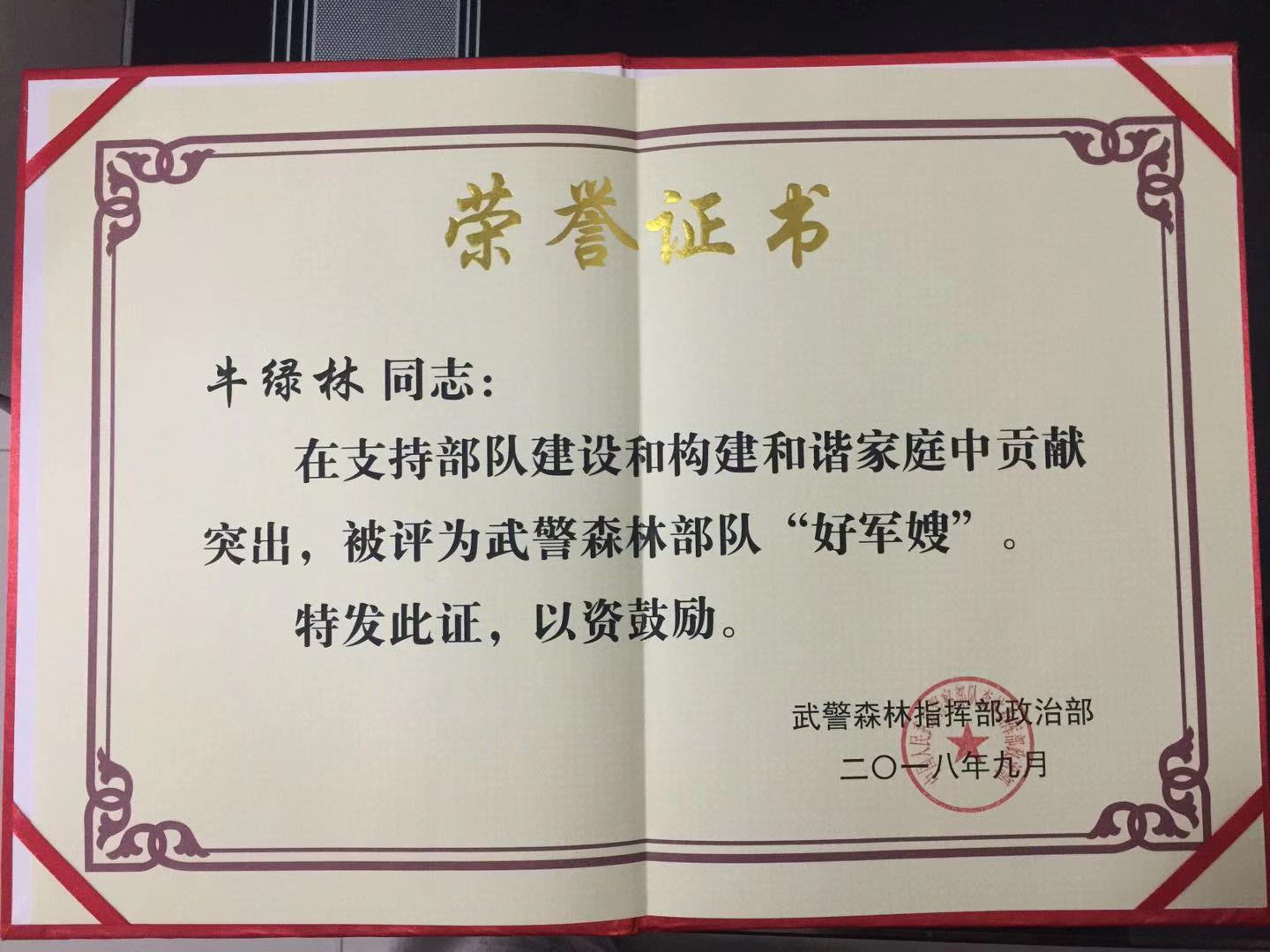 2016年7月,牛綠林就曾被其丈夫部隊駐地西藏昌都市婦聯表彰為“昌都市最美軍嫂”。2017年12月,在軍嫂網“共筑鋼鐵長城,尋找最美軍嫂”活動中,她又被評為全國百名“最美軍嫂”。2016年8月,因丈夫工作成績突出,一家三口還被部隊黨委安排到北戴河療養。在妻子的支持下, 孫武同志扎根基層,努力工作,所在中隊多年被總隊評為“基層建設先進中隊”;他個人也多次立功受獎,榮立“三等功”兩次,還被表彰為“優秀基層干部”、“優秀共產黨員”“優秀黨務工作者”等。
