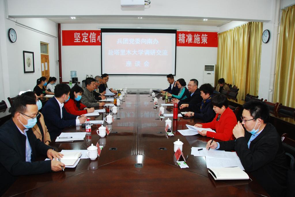 4月17日下午,兵團黨委向南辦副主任朱振軍一行來校調(diào)研,并召開調(diào)研交流座談會。塔里木大學(xué)黨委書記趙光輝,黨委副書記、紀委書記單洪山,副校長張利莉,黨委常委、副校長曲義勇,以及師市教育局、發(fā)改委有關(guān)領(lǐng)導(dǎo),學(xué)校有關(guān)部門領(lǐng)導(dǎo)、專家參加座談。會議由趙光輝主持,在行政樓317會議室召開。