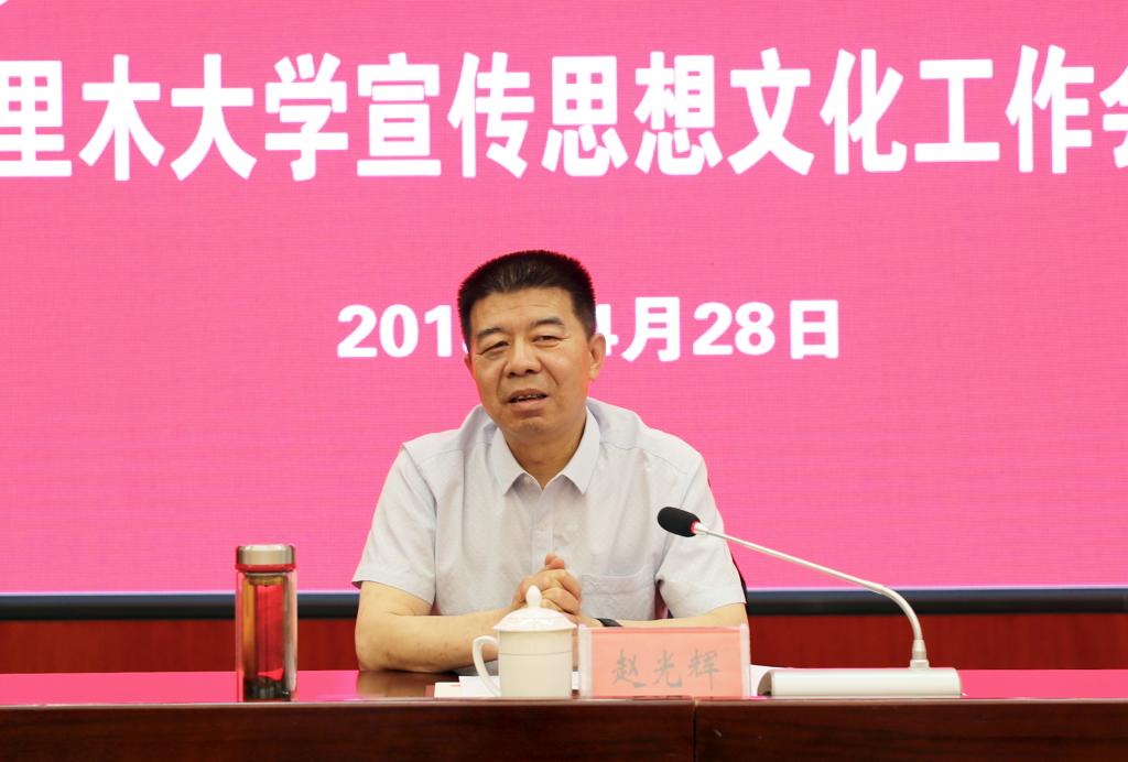 會上,趙光輝講話,從理論武裝、思想教育、意識形態、宣傳報道、紅色文化打造、形象展示等方面,對過去一年學校宣傳思想文化工作取得的顯著成效給予充分肯定和高度評價,深入分析了新形勢下宣傳思想文化工作面臨的新機遇新挑戰,深刻闡述了當前學校宣傳思想文化戰線肩負的新使命新任務,對增強做好宣傳思想文化工作的自覺自信和責任擔當、做好新形勢下學校宣傳思想文化工作明確了思路提出了要求。要求各基層黨委(總支)要切實把思想和行動統一到學校黨委對形勢的分析判斷和任務的安排部署上來,進一步提高政治站位,增強“四個意識”、堅定“四個自信”,全力以赴抓好各項任務落實,自覺承擔起舉旗幟、聚民心、育新人、興文化、展形象的使命任務,為加快推進兵團特點、南疆特色高水平大學建設提供堅強的思想保證和強大精神動力,以更加優異的成績向新中國成立70周年獻禮。