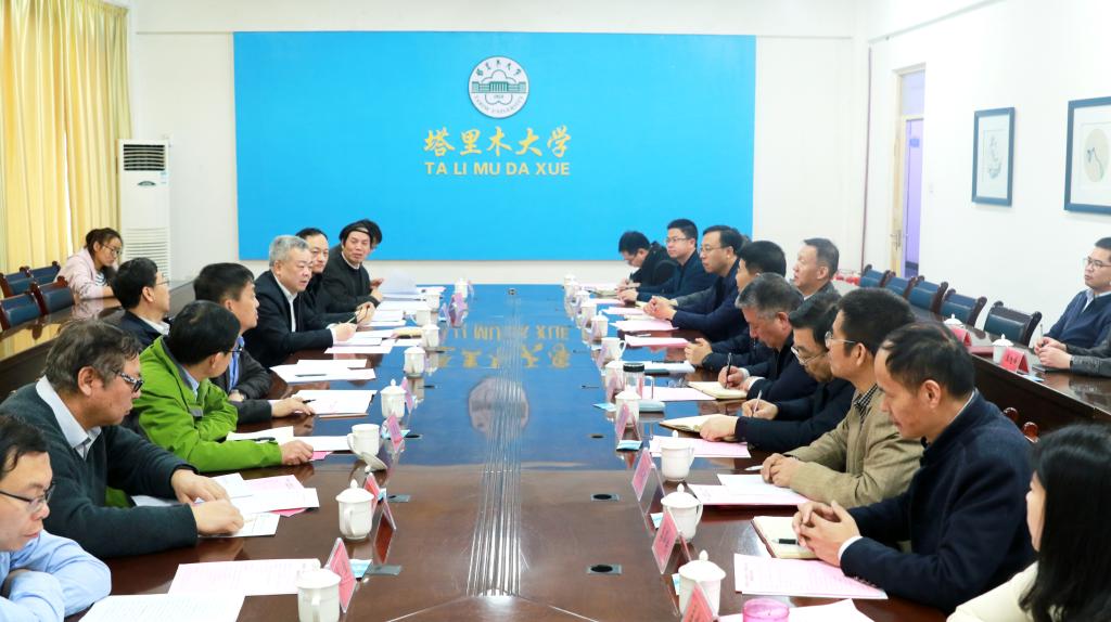 石河子大學副校長葉含春教授,塔里木河流域管理局總工周海鷹,浙江理工大學副院長吳理光教授,浙江大學化工學院副院長張林教授,浙江大學資環學院呂軍教授,浙江大學孫志林教授,塔里木大學有關部門、學院領導參加座談。(文/宋建玲 攝/楊瑞杰)