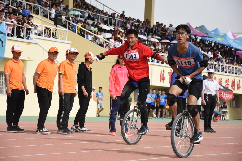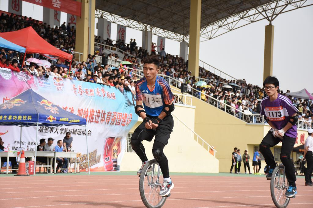 4月26日下午,男子獨輪車400米決賽順利舉行。跑道上,選手們整裝待發(fā)。發(fā)令搶一響,選手們迅速地踩上獨輪車,似離弦之箭一樣沖了出去,每一個動作都是一道亮麗的風(fēng)景線,每一個轉(zhuǎn)彎都展現(xiàn)著他們高超的技術(shù),他們在激烈的追逐。接近終點時,沖在最前面的一位選手突然從獨輪車上掉了下來,網(wǎng)絡(luò)工程2018級1班徐勇根將其超越,以1’03”87的成績第一個沖過了終點線,獲得了該項目的冠軍。