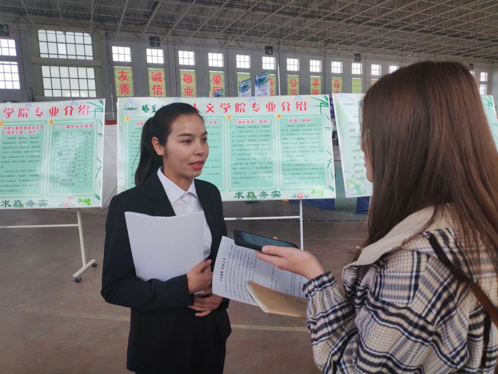 財務管理專業大四學生阿熱孜始麗·吐拉麥提,希望可以找到一份與所學專業有關的就業崗位,她更看中公司財務方面的工作崗位。“先就業,再擇業”,阿熱孜始麗·吐拉麥提說,為了抓住這次招聘機會,她提前篩選了一些感興趣的公司,很多公司采取網上投遞簡歷的招聘方式,然后再來到現場面試招聘。阿熱孜始麗·吐拉麥提說,校園招聘會上,公司數量和就業崗位越來越多,自己的選擇也更多,就業方便了許多,這對畢業生來說是非常有利的。她希望自己可以留在南疆、服務南疆、貢獻南疆。