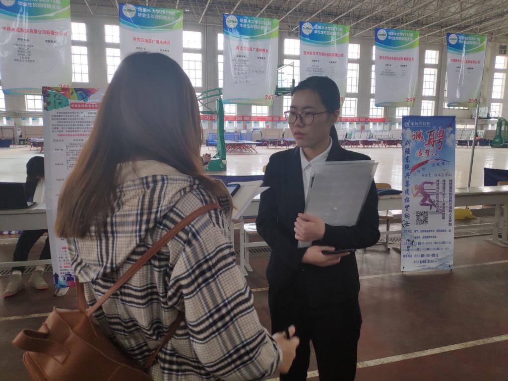 食品質量與安全19-1班蔣莉瑩想得到一份和所學專業相關的工作,對化驗檢測這類的職位比較有興趣。她說自己看重用人單位所處的區域和發展潛力,從與公司的交流中就可以看出公司的實力。她說,自己選擇留在家鄉工作,做求職簡歷,關注公司,篩選公司,了解公司,這些都是她為之做的準備。她說,自己所學的專業,考研學生人數較多,自己目前處于調劑當中,來到招聘會現場,可以多一個選擇。