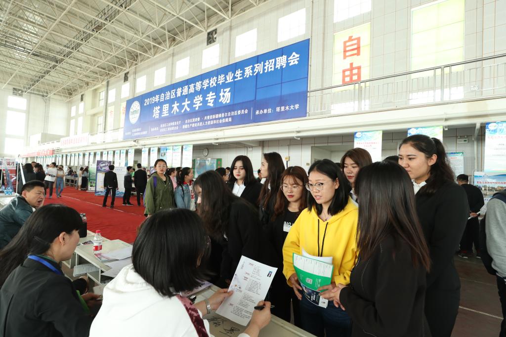 為了給廣大畢業生提供更多的就業機會,4月11日至12日,2019年自治區普通高等學校畢業生系列招聘會塔里木大學專場在風雨操場舉行。此次招聘大會共設三個專場,4月11日上午,南疆專場招聘會舉行;4月12上午,大型綜合專場招聘會舉行;4月12日下午,少數民族及女生專場招聘會舉行。