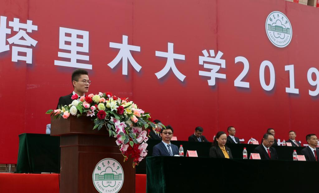 “經過兩年的學習生活,我深深地為學校披荊斬棘、拓荒前行而震撼,為學校擔當衛國、負重前行而嘆服;為一代代塔大人初心不改,薪火相傳的文化基因感到敬佩。置身兵團精神、胡楊精神的氛圍中,耳濡目染,紅色基因已融入血液。”2019屆新聞與傳播學碩士研究生李宗斌發言,表達了對母校的感激和眷戀之情,表示將在未來的道路上永遠堅守塔大的氣度與夢想,用青春和熱血為兵團的發展、新疆的繁榮、時代的進步、民族的復興貢獻自己的力量。