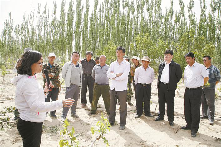 塔里木大學果樹專家、教授王新建(前中)給三師五十一團六連職工群眾講解灰棗樹修剪方法(資料圖片)。