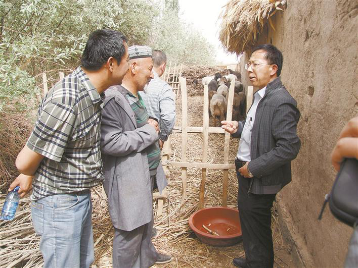 塔里木大學畜牧養殖專家、教授祁成年(右一)在向連隊養殖戶傳授技術(資料圖片)。