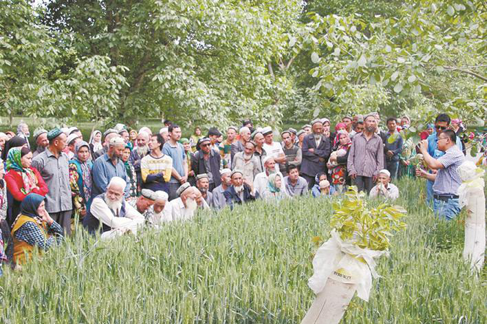 塔里木大學專家高山(前右一)在和田縣給當地農民傳授小麥種植技術(資料圖片)。