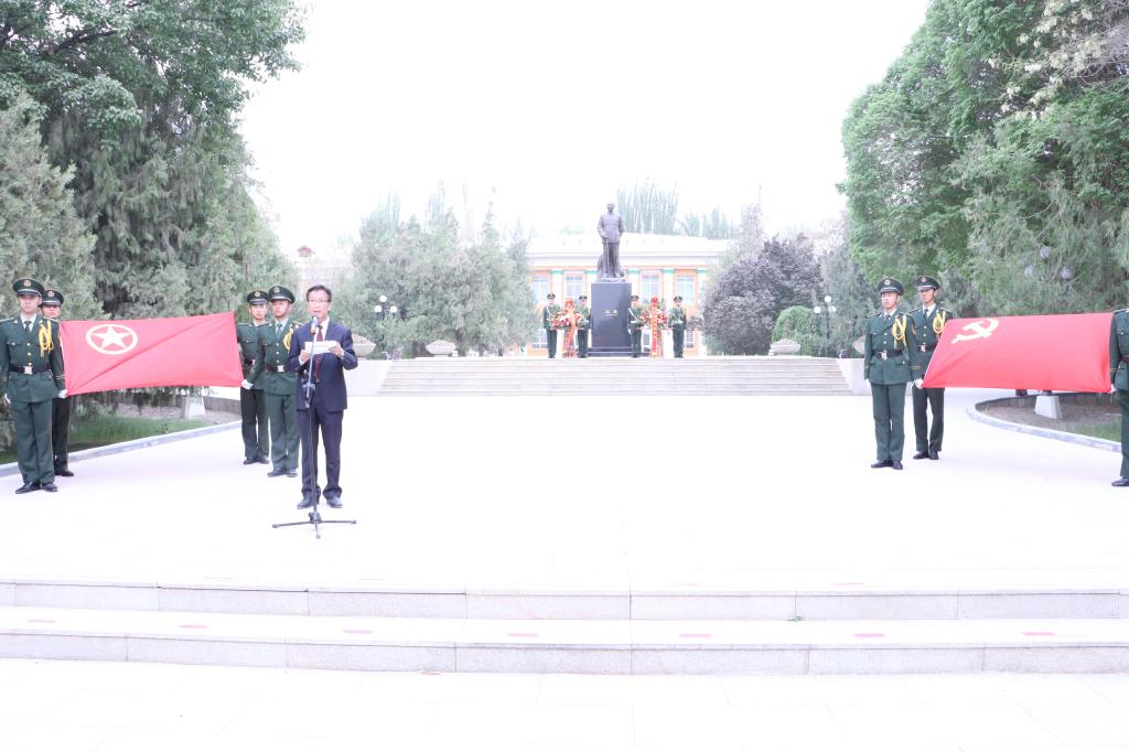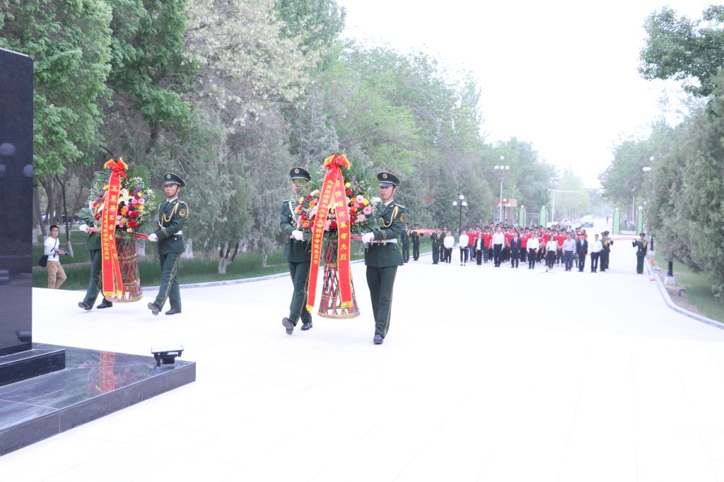 活動現場莊嚴肅穆,《義勇軍進行曲》奏響,全場齊聲高唱國歌。國歌畢,全體師生向王震將軍鞠躬致敬。廣場上,花籃整齊排開,伴隨著《獻花曲》,禮兵身姿挺拔,手持花籃,緩緩走向王震將軍銅像。白紅進、張春燕上前仔細整理花籃綬帶。