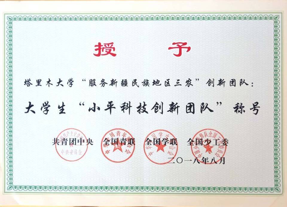 2018年8月,我校“服務新疆民族地區(qū)三農”創(chuàng)新團隊獲大學生“小平科技創(chuàng)新團隊”。