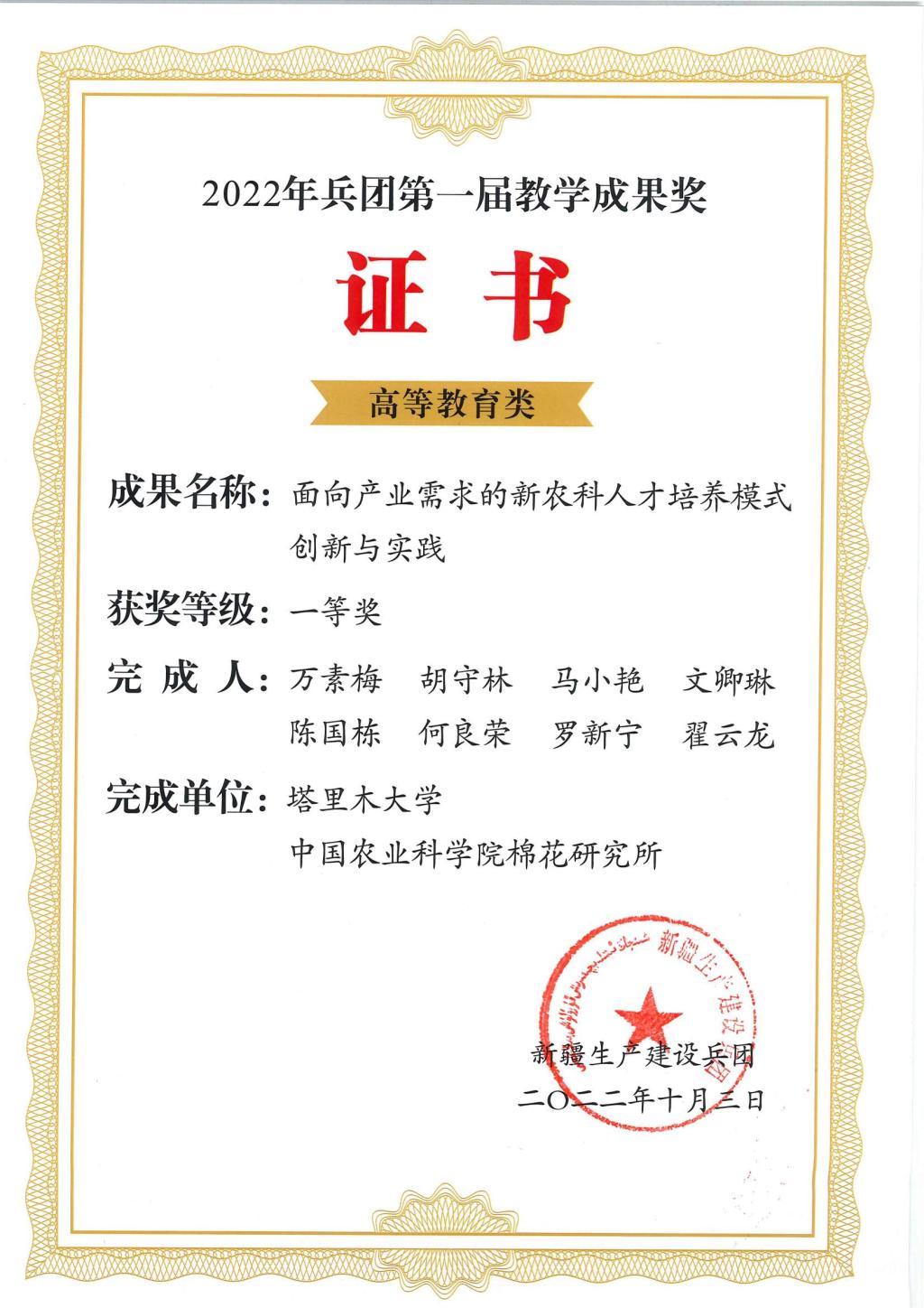 2022年10月,萬素梅等獲兵團教學成果獎一等獎。