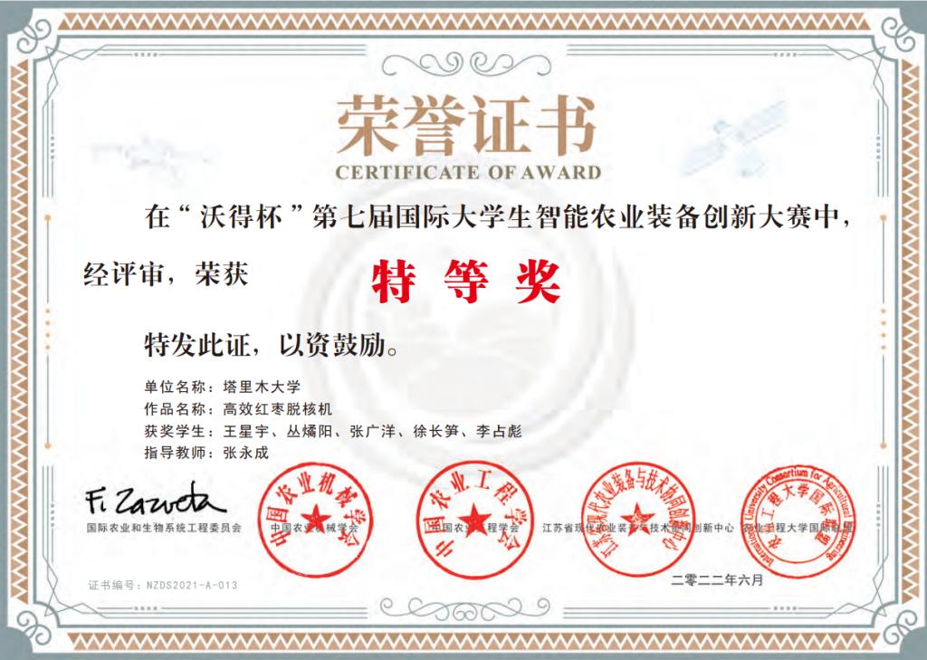 2022年6月,我校代表隊獲“沃得杯”國際大學生智能農業(yè)裝備創(chuàng)新大賽特等獎。