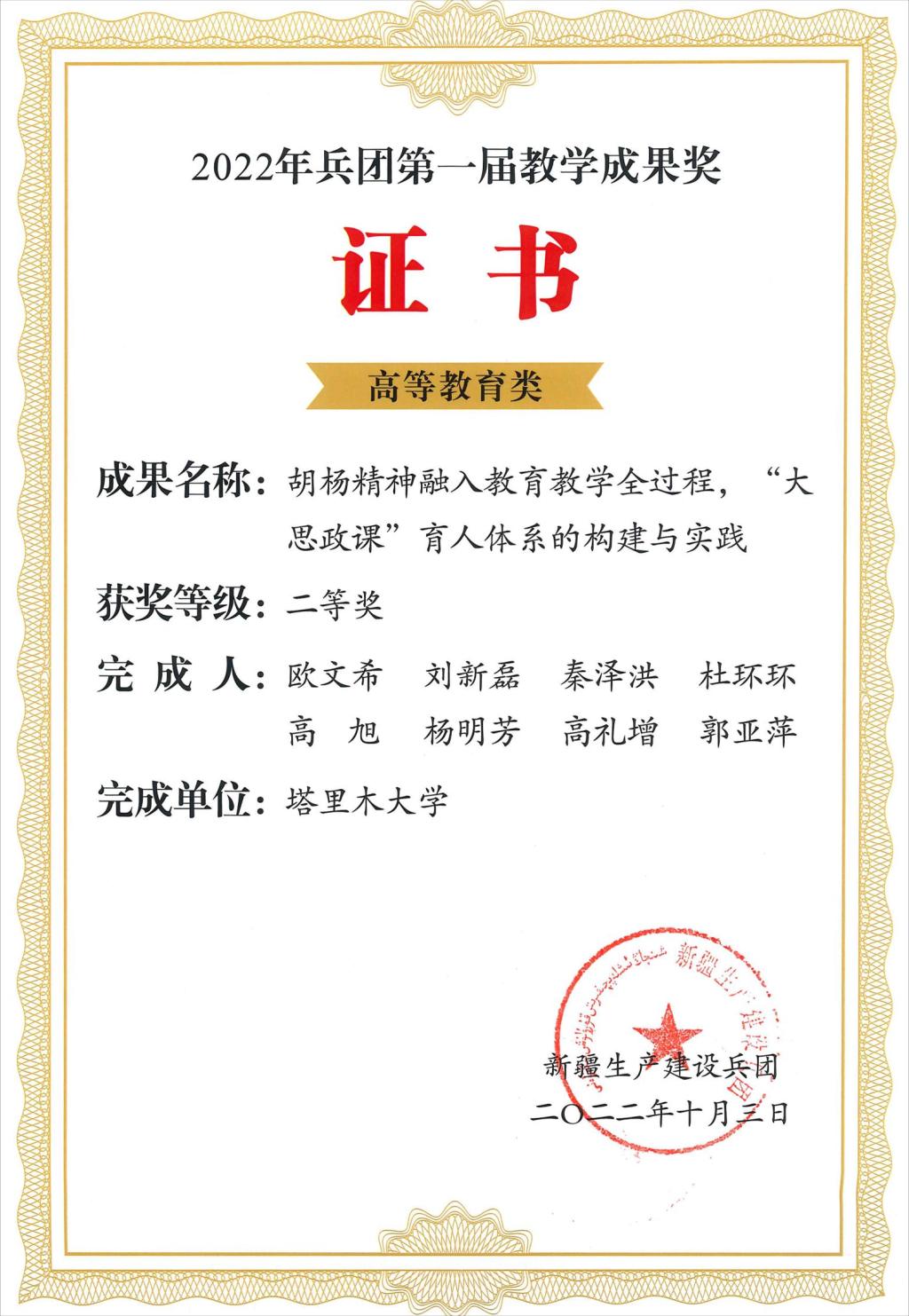 2022年10月,歐文希等獲兵團教學成果獎二等獎。