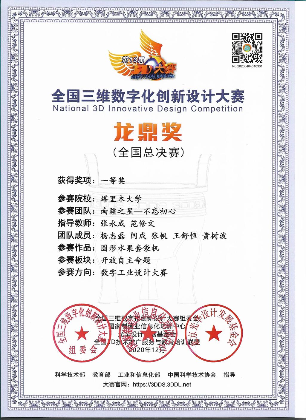2020年12月,我校代表隊獲全國三維數(shù)字化創(chuàng)新設計大賽龍鼎獎一等獎。