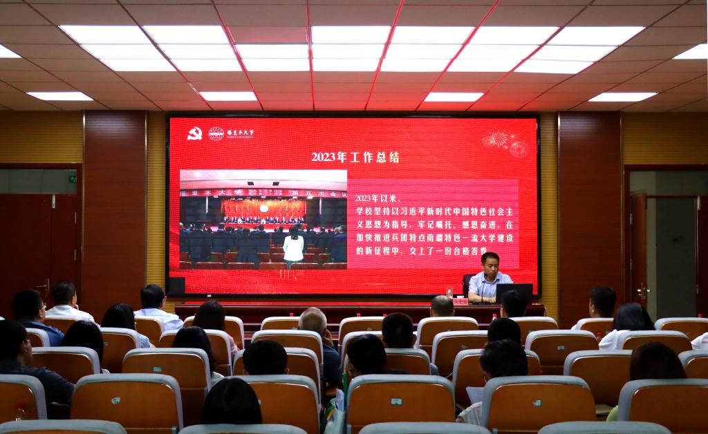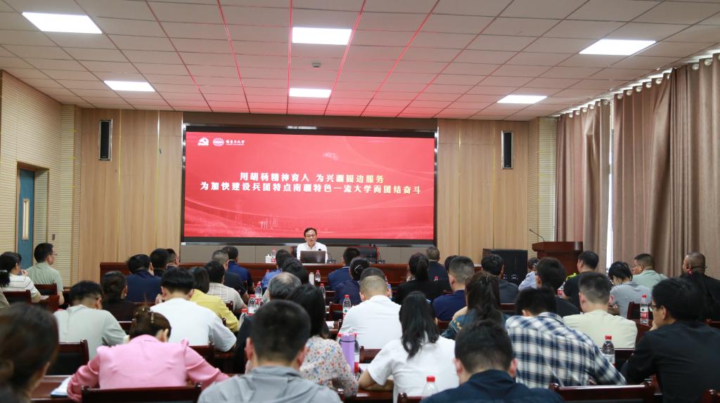 湯智輝在新校區(東擴區)一期機電院D109報告廳,為機械電氣化工程學院、基建處、后勤保障中心作了宣講報告。