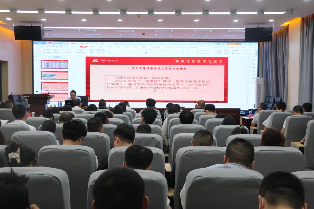 閆祥林在水建院1號會議室,為水利與建筑工程學院、審計處、發展規劃處作了宣講報告。