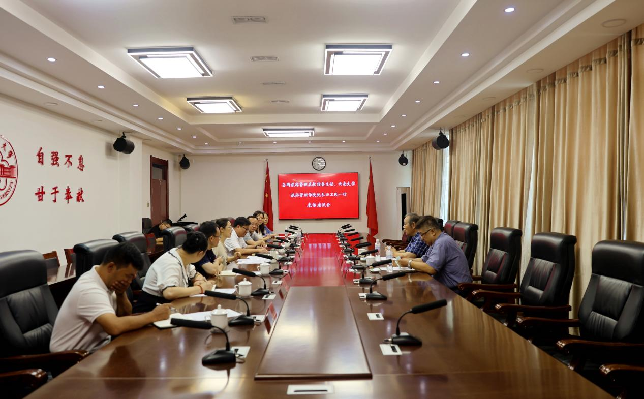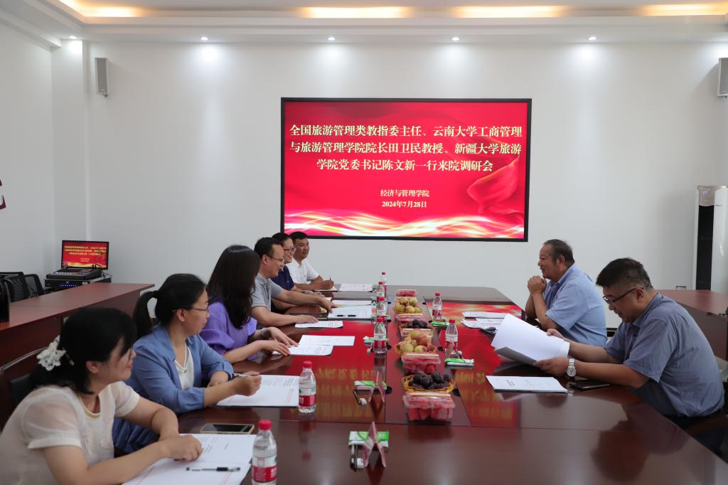7月28日-29日,全國旅游管理類教指委主任、云南大學工商管理與旅游管理學院院長田衛民教授,新疆大學旅游學院黨委書記陳文新一行來校交流。