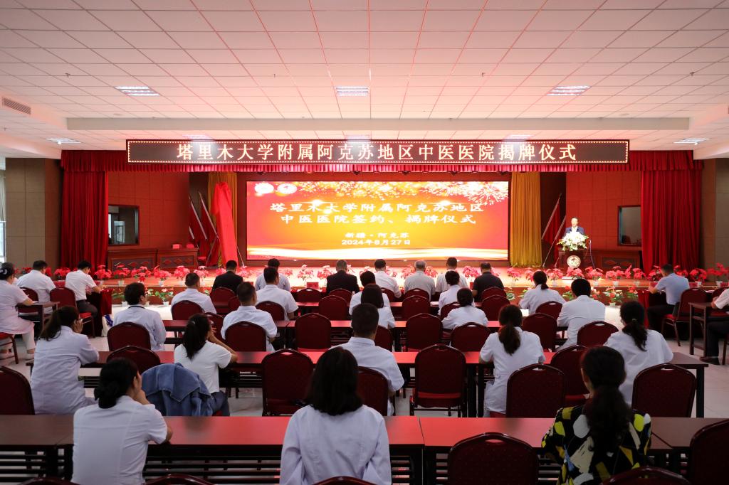 周興驥代表阿克蘇地委、行署,祝賀塔里大學附屬阿克蘇地區中醫醫院揭牌。希望校地搶抓合作機遇,發揮特色優勢資源,協同發展、合作共贏,共同推動阿克蘇地區中醫藥事業發展再上新臺階。