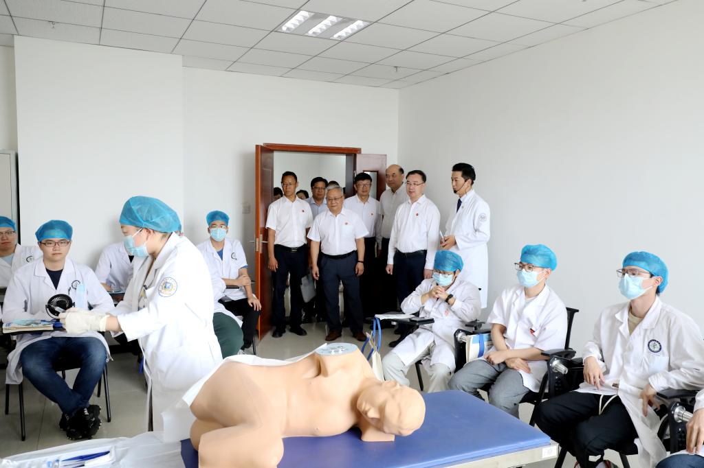 期間,閆祥林一行深入院史文化長廊、婦幼樓17樓教室、臨床技能中心、學生宿舍、食堂、國家區域醫療中心等處,詳細了解醫院師資力量、臨床教學、生活保障等情況,并看望了我校醫學院學生。